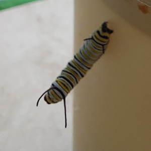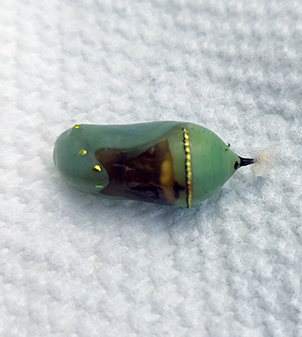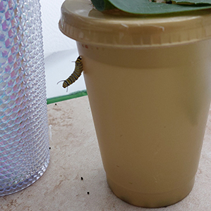 I have lost two caterpillars to the dreaded Tachinid fly. This was the first. I found the fly larva under the paper towel padding on the floor of the enclosure and disposed of it. | |