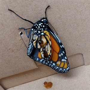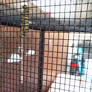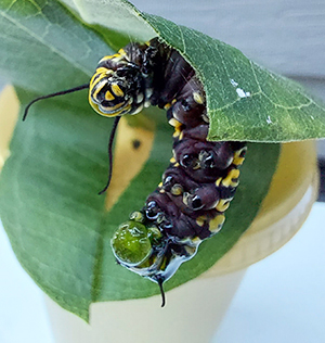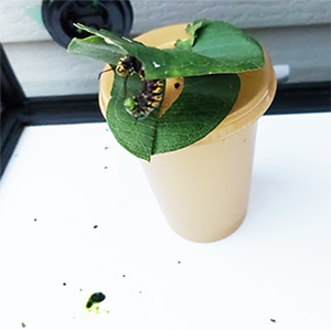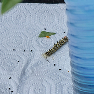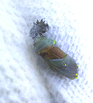 In the 2025 season, two of my caterpillars died from infestation by Tachinid fly. The first photo at left was taken in July when I was outside searching for eggs and came across this caterpillar, who has at least two T-fly eggs embedded in his body. I did not take him in. The second photo shows a caterpillar I had taken in earlier in the season, that now has a T-fly larva emerging from its dead body. |