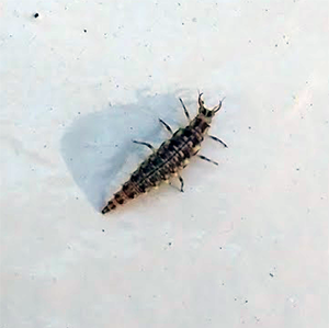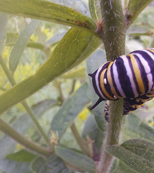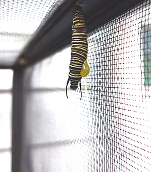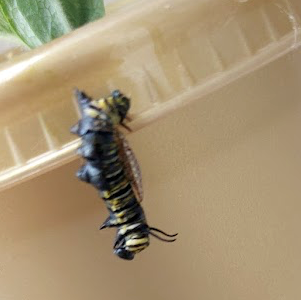 This one was completely unexpected and it actually took me awhile to figure out what had happened. At first, all I saw was the caterpillar's grossly discolored, swollen body. I had never seen anything like that before. Upon closer examination, however, I saw the Green Lacewing larva behind it. If you look closely at the first photo, you can see the lacewing's head at the top, and the side of its gold body on the right side, behind the dead caterpillar. Green Lacewings are common here in Iowa and across the midwest and they eat voraciously of other soft-bodied insects, including Monarch larva. I have no idea how this lacewing got into the enclosure. The only thing I can think of is that it was attached as an egg to a milkweed leaf that I brought in, and then it hatched once it was inside the enclosure? Lacewings do leave their eggs on milkweed. But I don't know. It only happened this one time. |