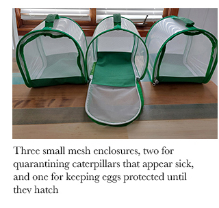 Just last year, I bought three very small mesh enclosures, one to be used specifically for eggs, and the other two to quarantine any caterpillars that seem to be sick, so they can't infect the others. These three little ones are occupied most of the summer by a couple eggs or a quarantined caterpillar. They have proven to be very useful, although again I have to put a rock inside each one to hold it down.