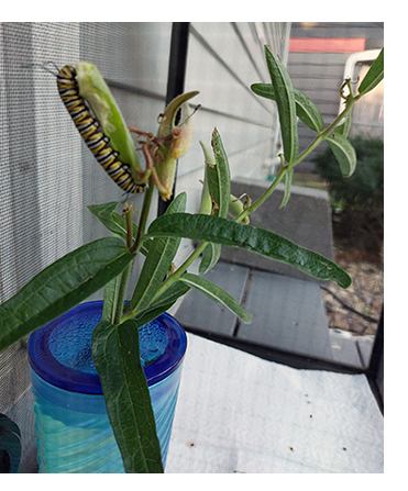 Although I often don't actually see a Monarch butterfly in the yard, I go looking for eggs every morning. They begin to appear in May. When I find an egg or a tiny, newly-hatched caterpillar, I clip the leaf off the plant and carry it to one of my two enclosures 20 ft away.