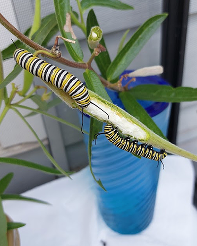 These caterpillars were the last two of 2024. The one at left was easily, hands down, the largest caterpillar I have encountered, and he did something none had done before. He ripped open this pod from a syriaca plant and ate the skin hungrily, as if he couldn't get enough of it. He (after he eclosed later, I saw he was a male) ate and ate, refusing to leave that pod or eat anything else, although I made sure there were always plenty of fresh leaves in the enclosure.After awhile, the other one left its leaf and went over to him, climbed onto the pod, and did the same thing, whether in imitation or instinct, I don't know. Were they also eating the fiber? It did look like it and the fiber began to look frazzled and stringy, like it had been picked at quite a bit. The two of them completely denuded that syriaca pod before morphing into chrysalis. The second caterpillar was quite a bit smaller than the first one. Because pods don't develop until late in the season, would all larva prefer these over leaves if they were available earlier? Why did these two prefer this pod skin over fresh leaves? I have noticed that over time, a caterpillar will shift its food preference; for example, a caterpillar will eat only tuberosa leaves, but as it matures, it eats only syriaca; also sometimes a caterpillar strongly prefers tuberosa flowers. |